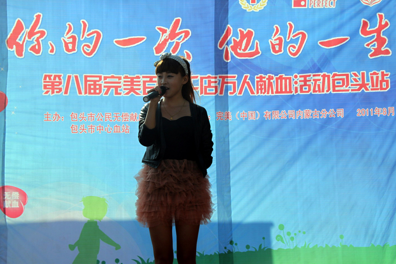 8月26日在内蒙古包头市包钢少年宫门前,内蒙古分公司与包头市中心血站共同举办了“第八届完美百城千店万人献血活动”,该活动得到了当地完美专卖店及优惠顾客的大力支持。