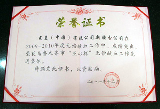 新疆分公司受乌鲁木齐市血液中心邀请参加了此次会议,大会上,新疆分公司被评为无偿献血先进单位,新疆分公司负责人黄华经理被评为无偿献血先进组织者。