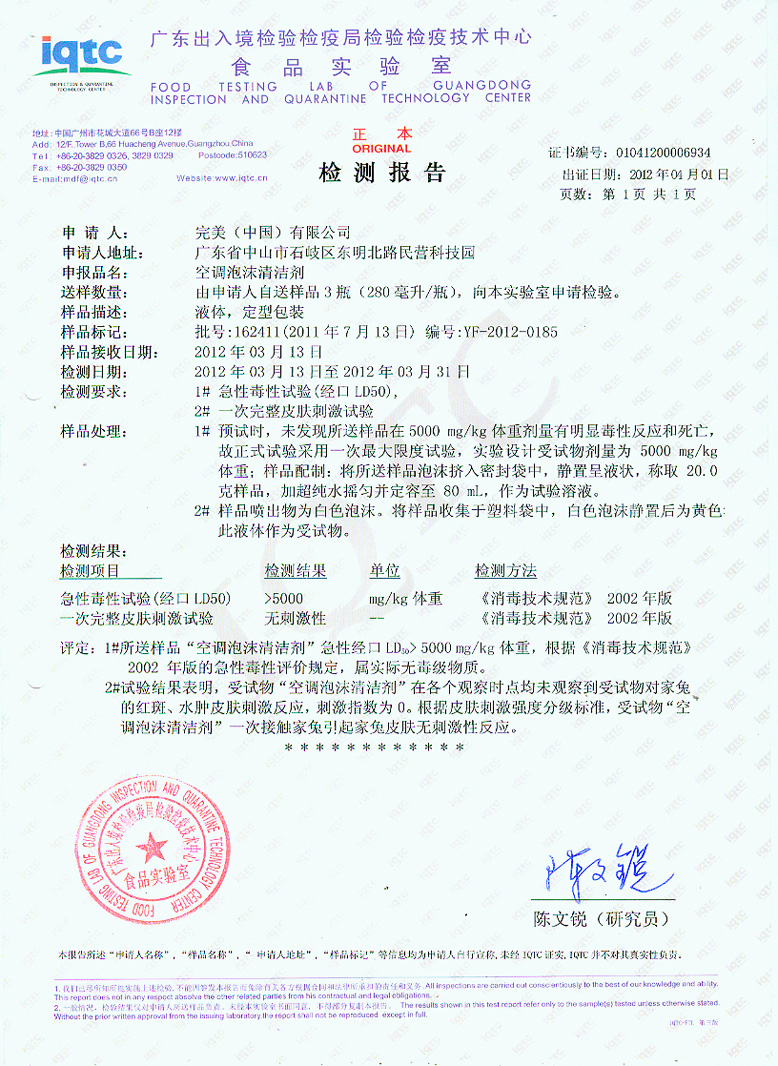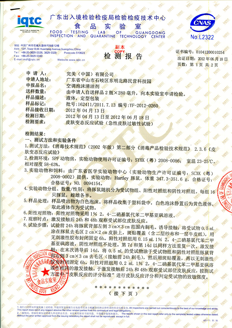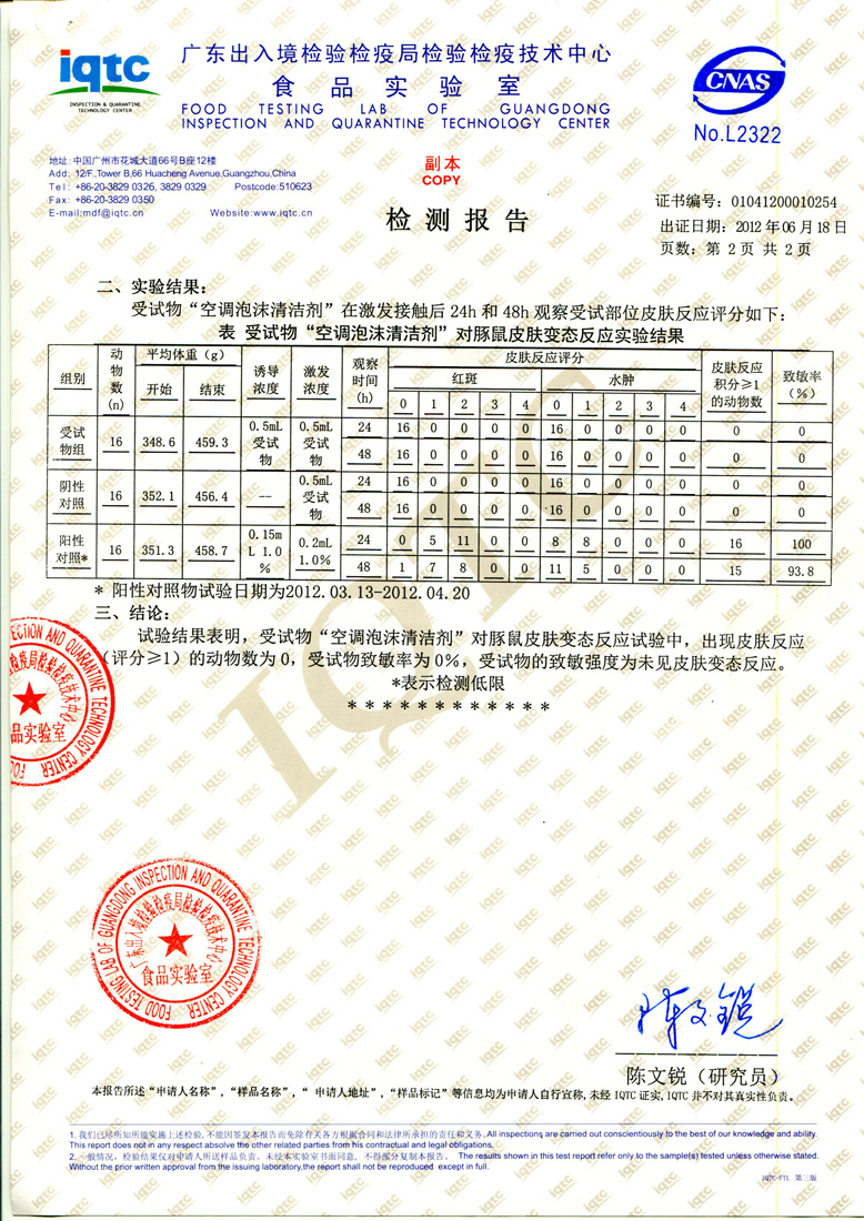 ACC空调泡沫清洁剂关于皮肤变态反应试验2
