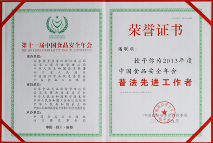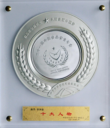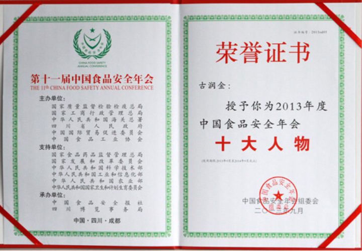 | 古润金被授予2013年度中国食品安全年会十大人物(证书) |