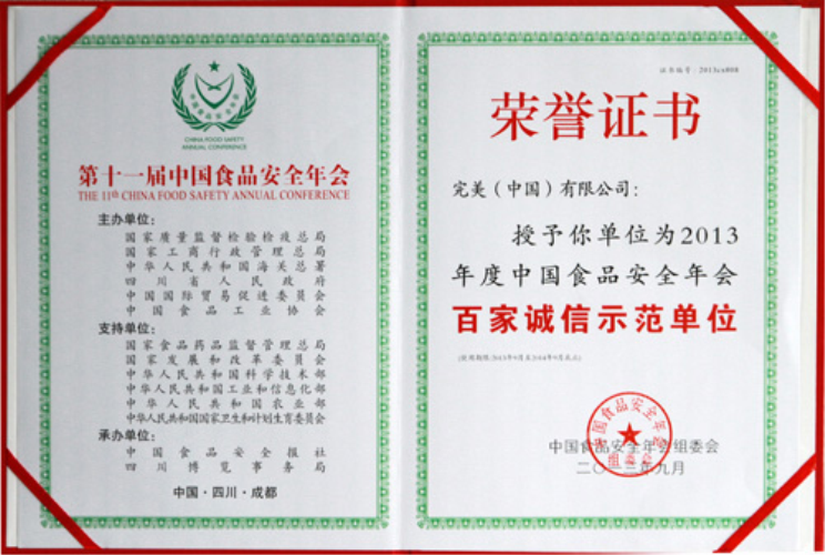 | 完美公司被授予2013年度中国食品安全年会百家诚信示范单位(证书) |