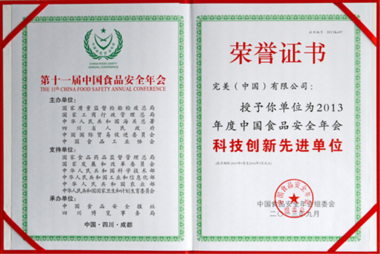 | 完美公司被授予2013年度中国食品安全年会科技创新先进单位(证书) |