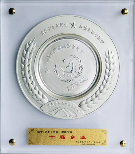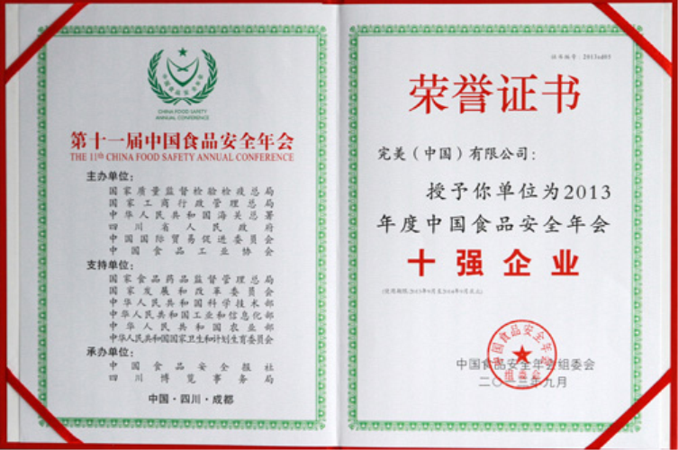 | 完美公司被授予2013年度中国食品安全年会十强企业(证书) |