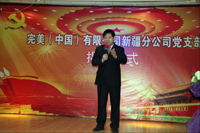 新疆分公司于2013年8月1日得到乌鲁木齐市高新区企业党委批复,成立中共完美(中国)有限公司新疆分公司支部委员会。目前有正式党员5名。在本次活动中,乌鲁木齐市高新区企业党委书记张宝山及完美新疆分公司负责人黄华共同为完美(中国)有限公司新疆分公司党支部揭牌。