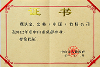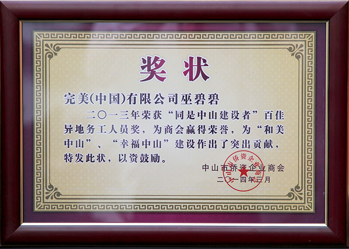 | 中山侨资企业商会奖状:巫碧碧获“同是中山建设者” |