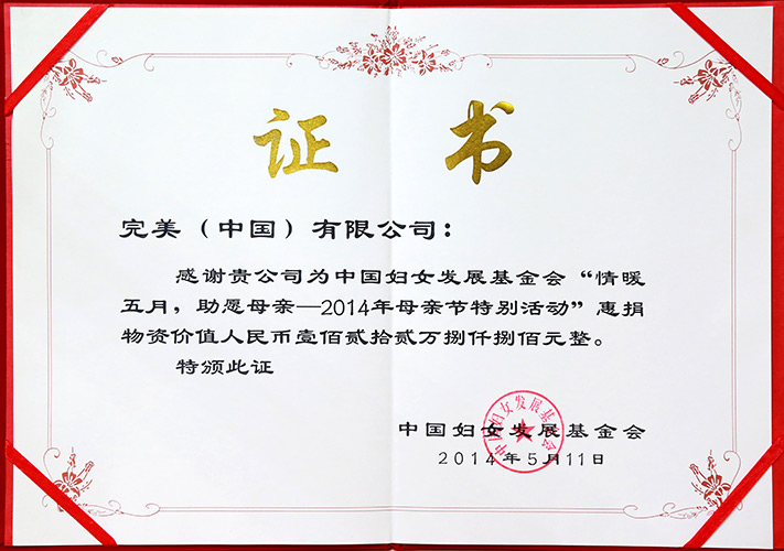 | “情暖五月,助愿母亲——2014年母亲节活动”完美向中国妇女基金会捐款1228800元 |
