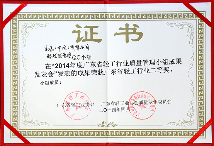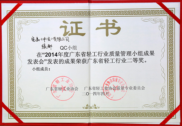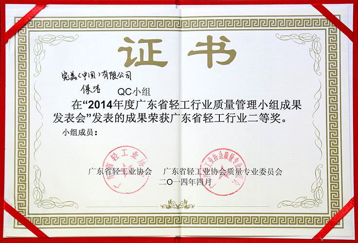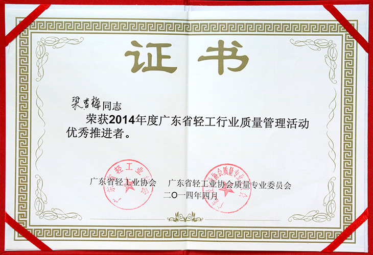 | 梁杏梅荣获“2014年度广东省轻工行业质量管理小组活动组织奖” |