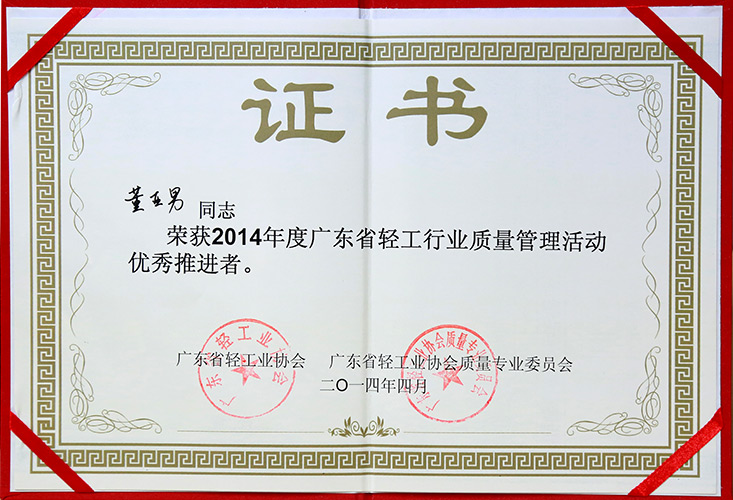 | 董亚男荣获“2014年度广东省轻工行业质量管理活动优秀推进者” |