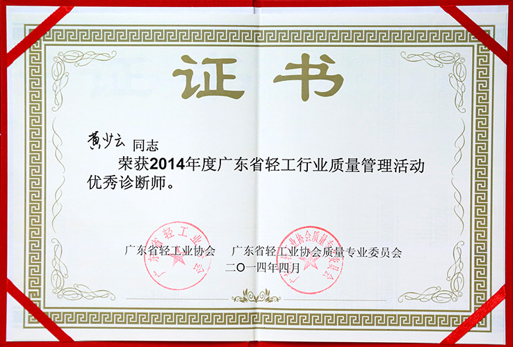 | 黄少云荣获“2014年度广东省轻工行业质量管理活动优秀诊断师” |