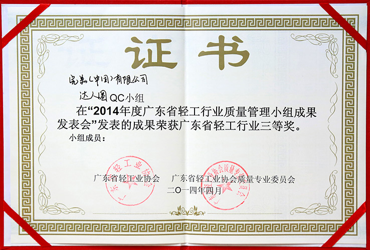 | 技术部达人QC小组荣获“广东省轻工业行业三等奖” |