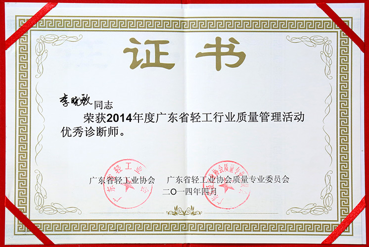 | 李晓敏荣获“2014年度广东省轻工行业质量管理活动优秀诊断师” |