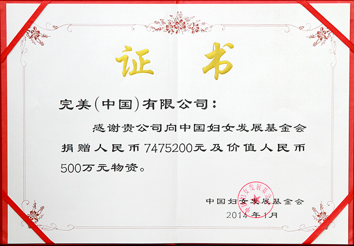 | 完美公司向中国妇女发展基金会捐赠7475200元人民币及价值人民币500万元物质 |