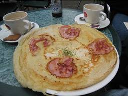煎饼是荷兰最普遍也最受欢迎的餐点,也是到荷兰后必须要吃的特色之一。荷兰的煎饼有点类似台湾的葱油饼,size稍微小一点,可是它的口味众多,有咸的培根、起司的口味,也有甜的水果、巧克力的口味等等。荷兰人吃煎饼会先在煎饼上加枫糖浆、蜂蜜、糖浆、巧克力酱或细糖粉,然后以刀叉或者直接用手指撕来吃。