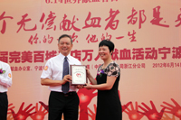 宁波市中心血站、宁波市献血办公室书记傅杏花女士向完美公司颁发的“无偿献血爱心单位”奖 |