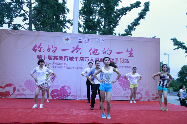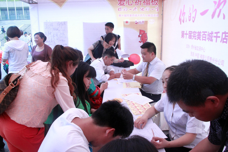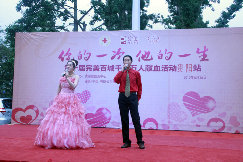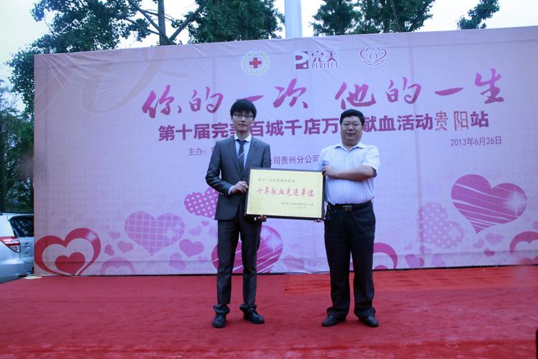 2013年6月21日,在得知贵阳市临床缺血后,贵州分公司迅速做出反应,于6月26日组织完美贵州无偿献血志愿队与贵州各地的完美伙伴共同举办“第十届完美百城千店万人献血活动”。